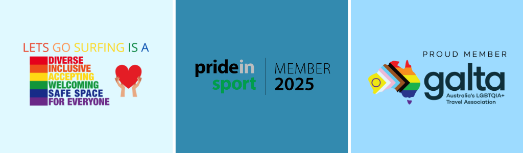 We’re proud members of both Pride in Sport and GALTA (the Gay & Lesbian Tourism Australia Association) and are always learning how to do better. We work hard to ensure all surfers feel seen, safe, supported, and celebrated.